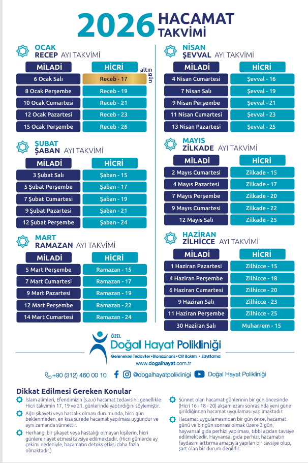 Herhangi bir rahatsızlık durumu olmadan, sağlığın korunması ( detoks amaçlı ) ya da sünnet maksadıyla yaptıranların, yılda 2 kez ( mevsim geçişleri olan ilkbahar ve sonbaharda ) hicri güne riayet ederek ( Hicri 17-19-21. günlerinde ) hacamat olması tavsiye edilmektedir.